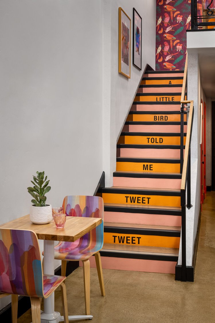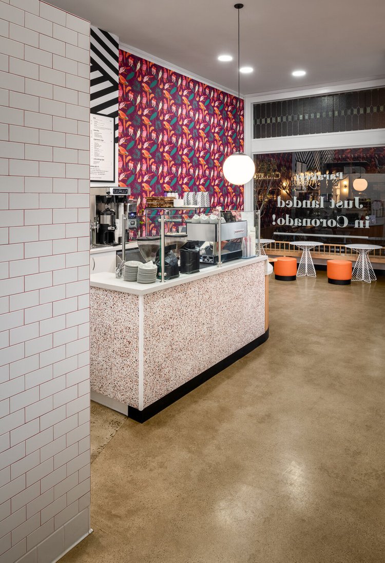 A colorful café renovation with patio and “To-Go” counter showcasing the playful brand. To align with our client’s bright and warm personality, we customized graphics and budget-conscious mixed materials.